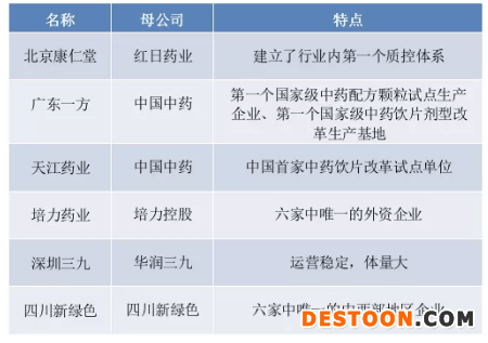 2001年4月,《中藥配方顆粒管理暫行規(guī)定》頒布,將中藥配方顆粒納入中藥飲片管理范疇,實(shí)行批準(zhǔn)文號管理。6家企業(yè)獲得國家試點(diǎn)資質(zhì),占據(jù)了80%以上的市場份額,分別為:江陰天江藥業(yè)、華潤三九現(xiàn)代中藥、廣東一方制藥有限公司、四川新綠色藥業(yè)、北京康仁堂藥業(yè)、南寧培力制藥。