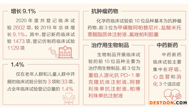 《報(bào)告》顯示,2020年針對(duì)特定人群開展的臨床試驗(yàn)相對(duì)較少,僅在老年人群和兒童人群中開展的臨床試驗(yàn)分別為3項(xiàng)和33項(xiàng),占全年臨床試驗(yàn)登記總量的1.4%。特殊人群藥物研發(fā)應(yīng)引起重視。