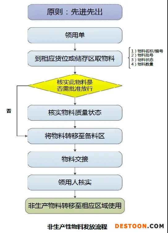 建立生產(chǎn)物料發(fā)放管理程序;物料按批發(fā)放使用;只有經(jīng)放行并有合格狀態(tài)標(biāo)識的物料方可發(fā)放;根據(jù)生產(chǎn)指令和/或物料提取單核對發(fā)放物料;發(fā)放生產(chǎn)物料時應(yīng)檢查物料的外包裝情況。