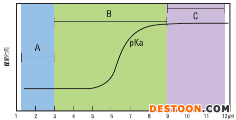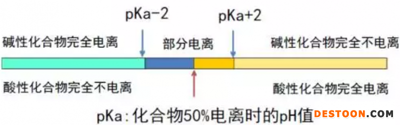 流動(dòng)相pH值一般選取pKa±2范圍之外,以保障化合物處于分子狀態(tài),減少電離,此狀態(tài)下化合物疏水性較強(qiáng),色譜柱保留時(shí)間較長(zhǎng),能獲得良好的峰型。