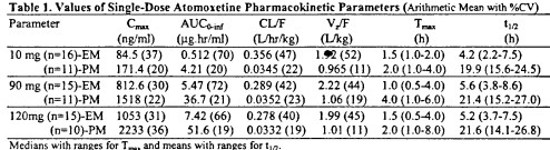 托莫西汀在體內(nèi)主要由CYP2D6酶代謝,兩種不同代謝的受試者PM(慢代謝者)和EM(快代謝者)對(duì)于藥物的吸收也不同,結(jié)果如下: