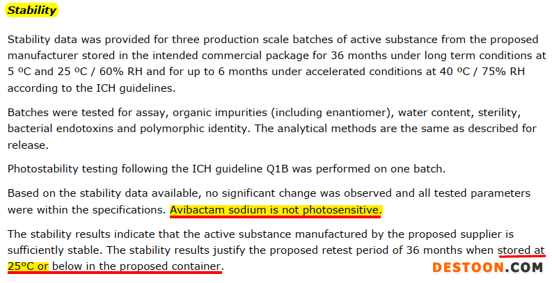 穩(wěn)定性結(jié)果表明,阿維巴坦鈉在商業(yè)化包裝條件下足夠穩(wěn)定。穩(wěn)定性結(jié)果證明,在25°C或以下條件下保存,建議復(fù)試期為36個(gè)月。