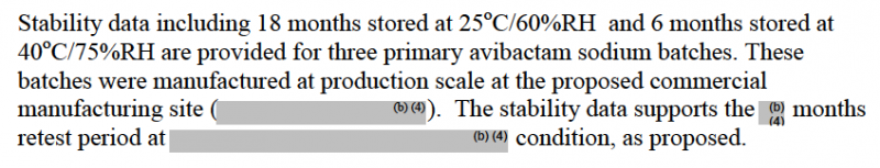 穩(wěn)定性考察結(jié)果:阿維巴坦鈉采用商業(yè)化包裝在25℃/RH60%條件下放置18個(gè)月;在40℃/RH75%條件下放置6個(gè)月進(jìn)行考察。未能查詢(xún)到明確的包裝貯藏條件。