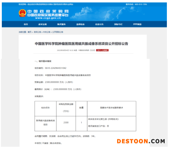 中國政府采購網(wǎng)日前發(fā)布《中國醫(yī)學科學院腫瘤醫(yī)院醫(yī)用磁共振成像系統(tǒng)項目公開招標公告》(下稱《公告》),中國醫(yī)學科學院腫瘤醫(yī)院準備以2300萬采購醫(yī)用磁共振成像系統(tǒng),并明確表示“不接受進口產(chǎn)品”。